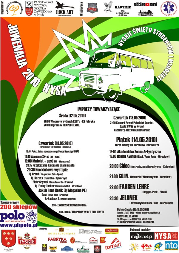 Serdecznie zapraszamy do wzięcia udziału w dorocznym Święcie Studentów PWSZ w Nysie. Juwenalia 2010 to dwa dni (13,14 maja 2010) doskonałej zabawy. Zobacz poniżej plakat z programem imprezy (kliknij aby powiększyć).