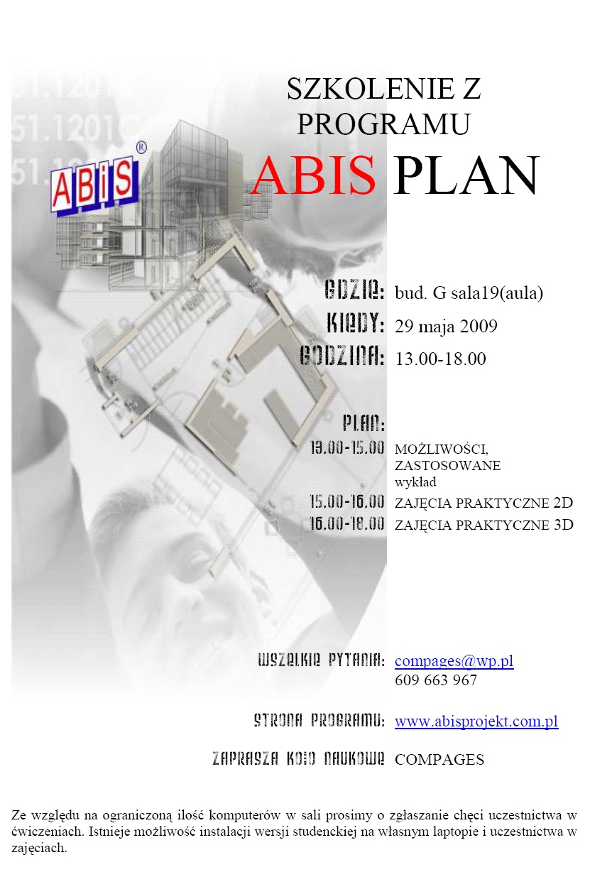 Koło naukowe "Compages" działające przy instytucie Architektury serdecznie zaprasza na szkolenie otwarte z obsługi programu komputerowego ABIS PLAN (CAD). Szkolenie odbędzie się 29.05.2009, bud G, sala 19 w godz. 13.00 - 18.00